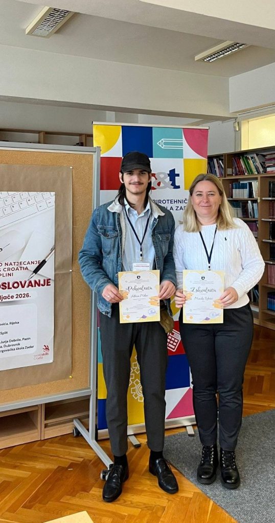 Na Međužupanijskom natjecanju u disciplini Tajničko poslovanje održanom u Zadru naš učenik Adrian Mikac osvojio je 4. mjesto i plasirao se na državnu razinu natjecanja WorldSkills Croatia- najveći spektakl strukovnog obrazovanja u ovom dijelu Europe od 5. do 7. svibnja 2026. na Zagrebačkom velesajmu.